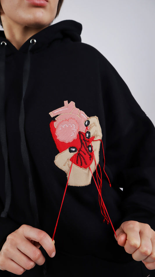 W promocjiBLACK HOODIE WITH FABRIC APPLIQUÉ